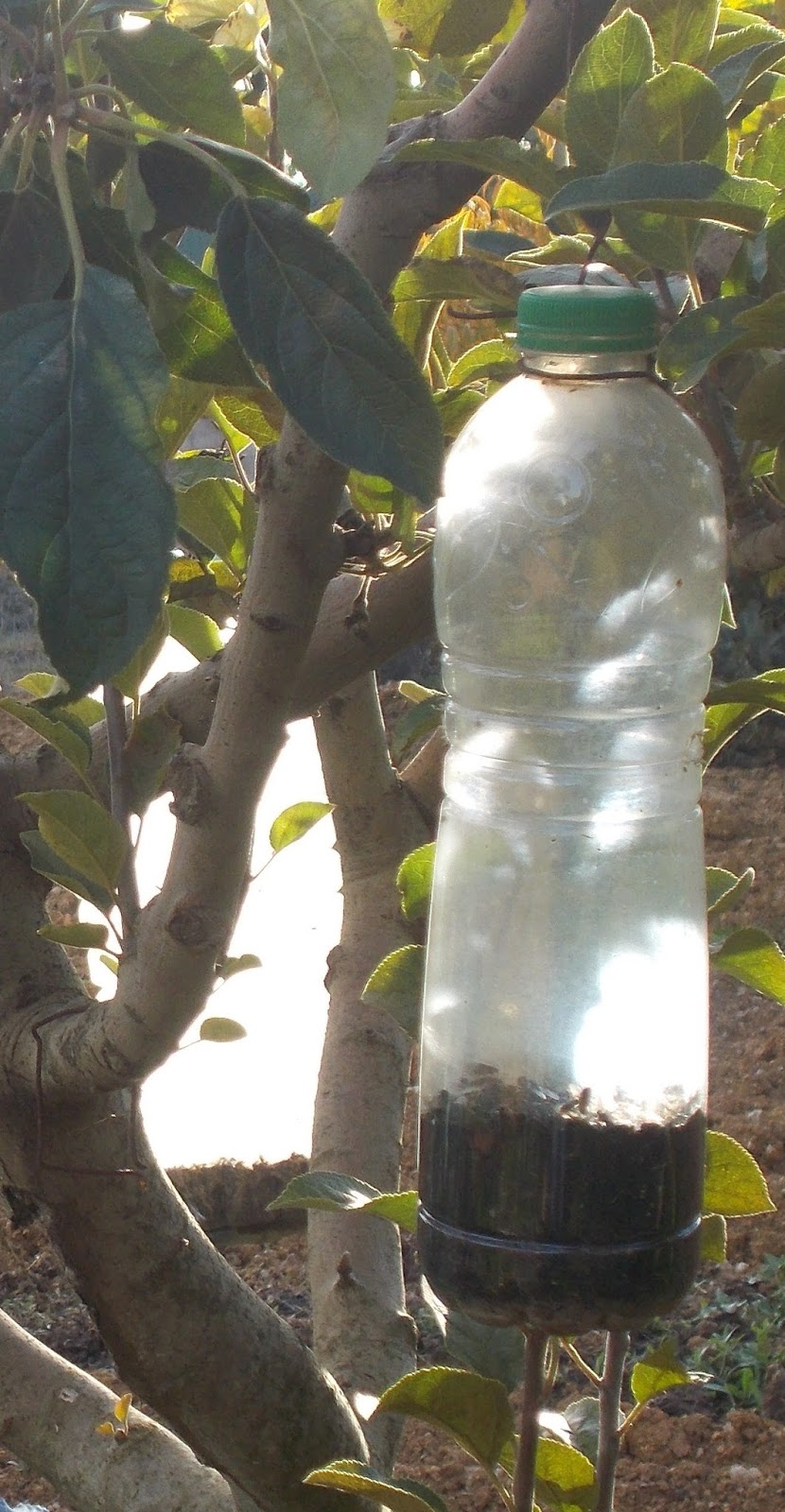| Armadilhas para as moscas, cada árvore tem 2 ou 3 garrafas destas para apanhar as moscas africanas que estragam a fruta. O que vêem dentro da garrafa são moscas, milhares delas. Alguém me dizia que as outras moscas "vulgares" que também são apanhadas nestas armadilhas afinal são úteis na horta para combater alguns tipos de pragas. Não sei qual a veracidade desta informação ?! |
