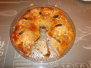 Comecei no sábado logo de manhã com uma espécie de bolo rainha, especialidade cá de casa ... não é mais do que uma massa de pão brioche onde depois de levedar, adicionei vinho do Porto, frutos secos a gosto (200g de passas, amendoas, avelãs, nozes) e raspa de laranja, formar a coroa, deixar levedar mais um pouco e vai ao forno.
